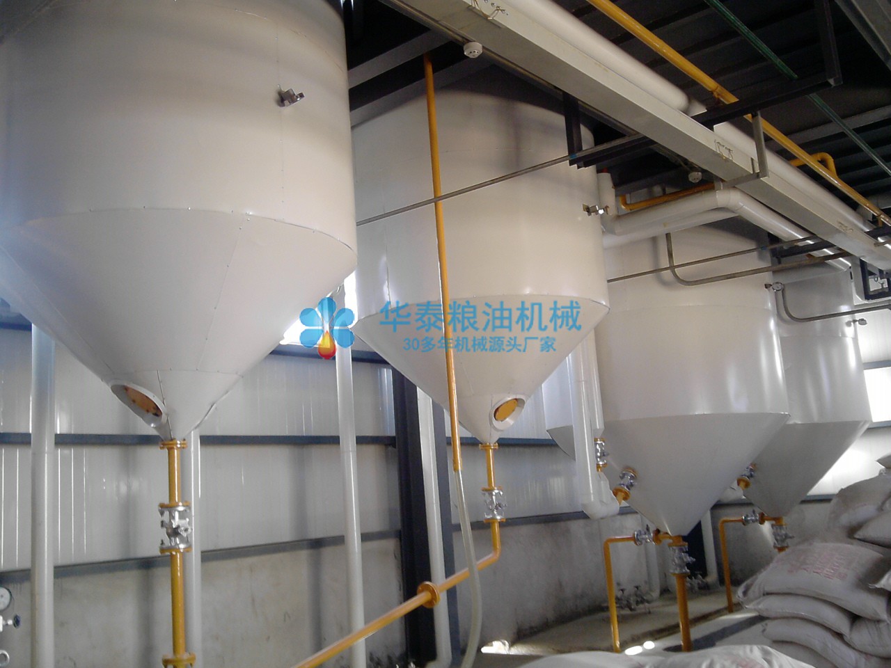 主要設備 脫膠鍋,脫酸鍋,脫色鍋,皂腳鍋,熱水箱,堿液箱,堿液泵,脫色油箱,脫色油泵,振動過濾機,濾板洗滌池,空壓機,脫色用水噴射真空泵,板式加熱器,導熱油加熱器,脫臭塔,脫臭油泵,成品油儲罐,成品油泵等
