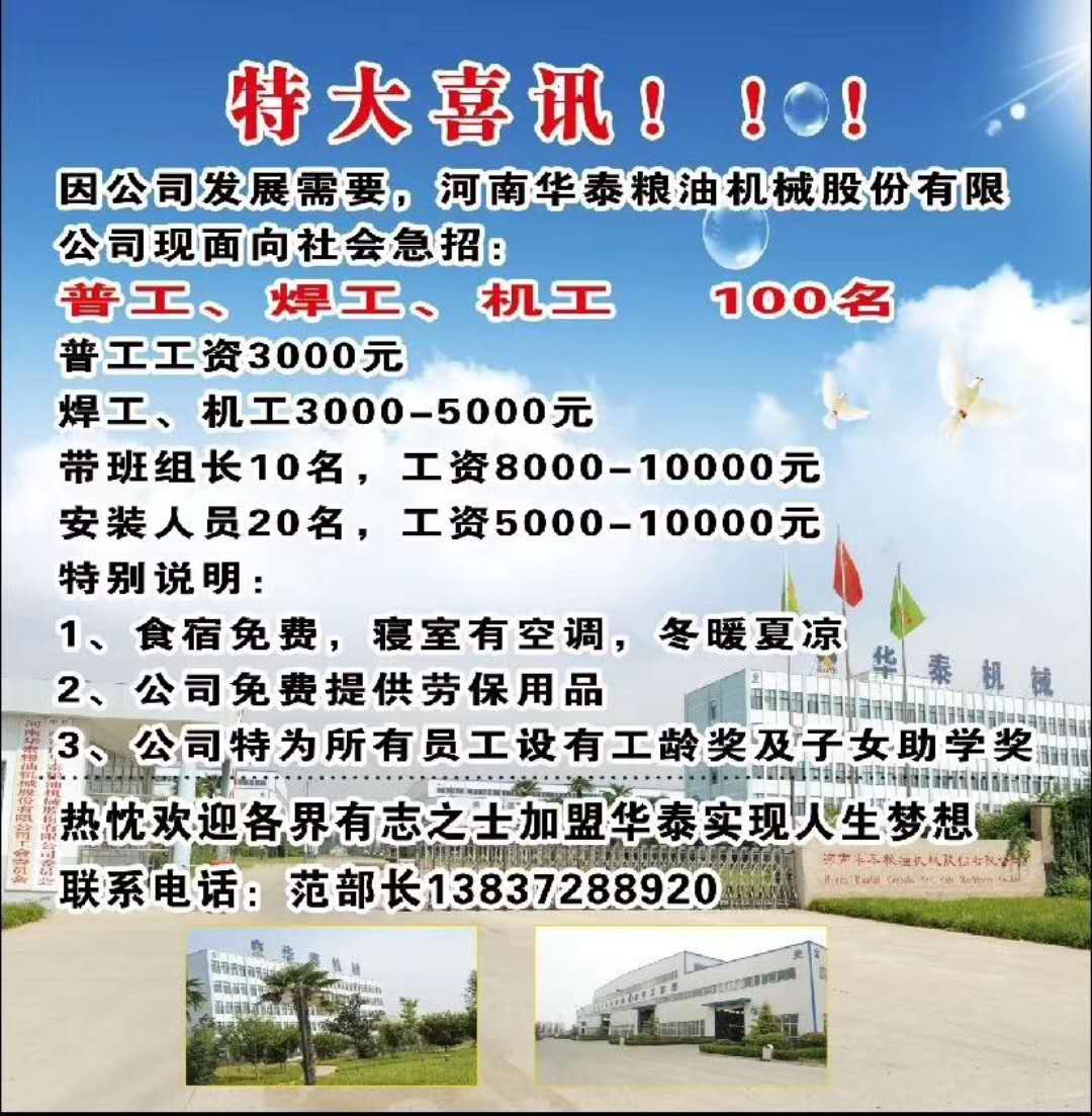 ?因國內外油脂項目需要,現需要招聘項目安裝隊長,項目經理,項目工程師等50名,待遇豐厚,歡迎油脂界精英們加入河南華泰糧油機械股份有限公司!!